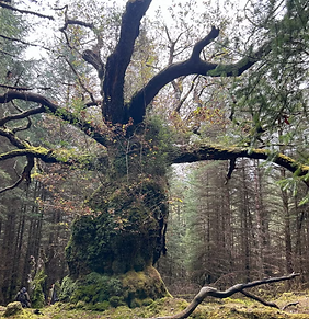 Ancient oak tree. Flora manages to survive in the forest sheltered in a hollow oak tree.